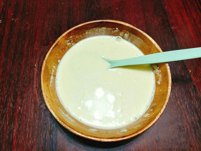 - Bước 3: Cho bột khoai, bột chiên giòn, bột mì vào 1 cái bát, thêm từng ít nước và khuấy đều để hỗn hợp bột hơi đặc mà không quá loãng. Bạn có thể tự điều chỉnh hỗn hợp bột, nếu thích khoai có lớp vỏ hơi dày thì pha bột đặc 1 chút và ngược lại. Lưu ý: nếu loại khoai lang bạn mua không ngọt thì có thể thêm vào phần bột ướt 1-2 thìa đường nếu thích.