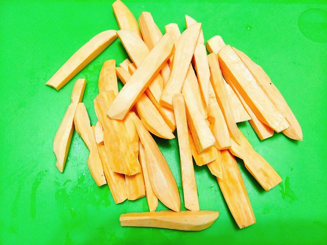 - Bước 1: Khoai lang rửa sạch rồi nạo vỏ, thái khoai thành những thanh dài tầm 1 ngón tay.