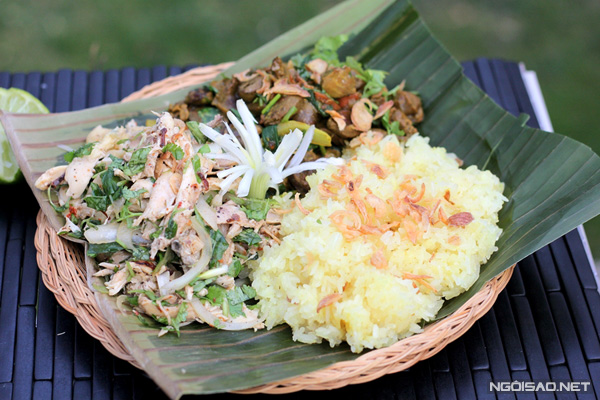 - Khi dùng bạn xếp một ít xôi vào đĩa, thêm mề, tim xào và gà bóp rau răm vào.