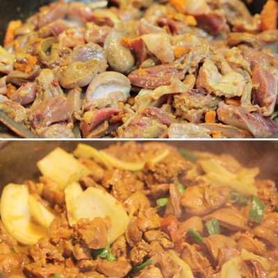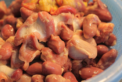 - Mề gà, tim gà rửa sạch, để ráo, nếu mề gà lớn có thể cắt làm đôi. Nếu không có mề gà, tim gà sẵn, bạn có thể dùng 1/2 con gà để trộn, còn 1/2 con còn lại bạn chặt nhỏ, xào với nghệ.