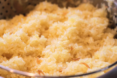 - Gạo nếp sau khi ngâm, cho vào nồi , hấp chín, thỉnh thoảng dùng đũa xới đều, rưới vào một ít hành phi.