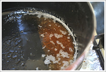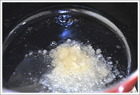 Làm nóng chảo khác trên bếp, cho đường vào đun chảy. |