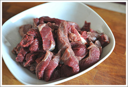 Rửa xong bạn vớt thịt ra để ráo, cắt thành từng dải dày để khi đun sôi trong nước, từng đoạn sẽ co lại nhưng không quá nhiều. |