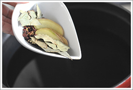Đặt một nồi nước nhỏ lên bếp, thêm hạt tiêu, gừng và ít lá chanh hay bưởi cho thơm (không có lá tươi bạn có thể dùng lá khô cũng được) |