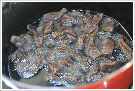 Làm nóng chảo trên bếp, đổ dầu ăn vào (lượng dầu phải xâm xấp mặt thịt khi trút thịt vào), khi dầu ăn sôi thì thả phần thịt vừa ráo vào. Chiên thịt cho đến khi thịt săn lại. |