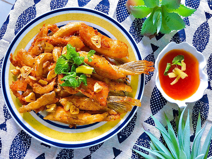 Bước 2:Dầu nóng cho cá vào chiên với lửa nhỏ vừa đến khi vàng giòn thì cho phần tỏi thái lát vào đảo sơ rồi cho ra rây để ráo dầu.