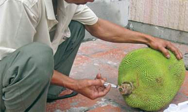 Trái cây ép chín như mít thường được tiêm hóa chất vào phần cuống. Ảnh minh họa