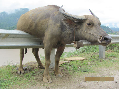 Trên QL 12 từ thị xã Mường Lay về huyện Mường Chà - tỉnh Điện Biên, tôi tình cờ phát hiện một con trâu đeo mõ lại mắc kẹt trên lan can hàng rào sắt bảo vệ ven đường, sát ngay cột cây số cách Chan Nưa (Điện Biên) khoảng 22 km.