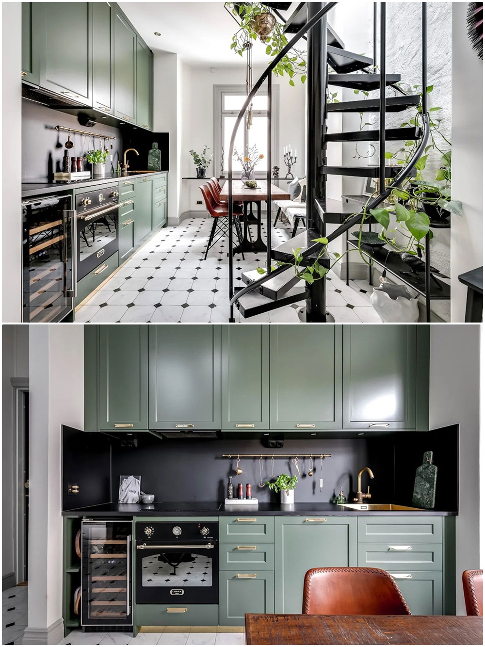 Khác hẳn với gam chủ đạo là trắng và xám bên trong phòng khách và phòng ngủ, nhà bếp gây ấn tượng bằng bộ tủ sơn màu xanh lá vô cùng bắt mắt. Tủ bếp gỗ sơn màu kết hợp cùng phụ kiện kim loại và mặt bếp màu đen tạo ấn tượng thị giác khắc sâu với người nhìn.