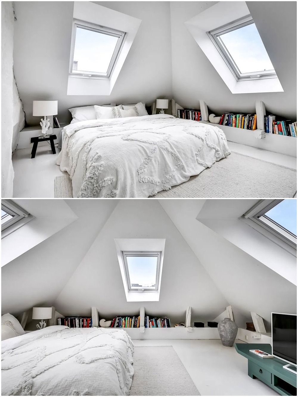 Cầu thang xoắn ốc sẽ mang bạn đến phòng ngủ gác mái lãng mạn bên trong căn hộ. Diện tích tuy hạn chế nhưng vì thế mà khiến cho không gian này thêm phần ấm cúng và dễ chịu hơn. Ngoài ra, nhờ sở hữu đến 3 thiết kế cửa sổ trần bằng kính, phòng ngủ này là không gian đọc sách lý tưởng vào ban ngày và ngắm sao trời thoải mái vào ban đêm.