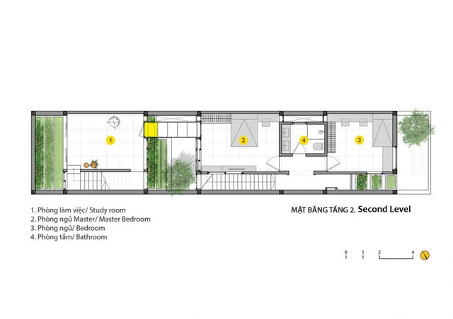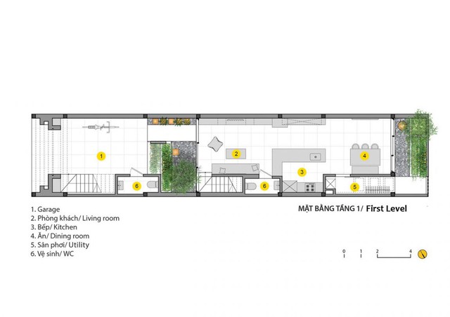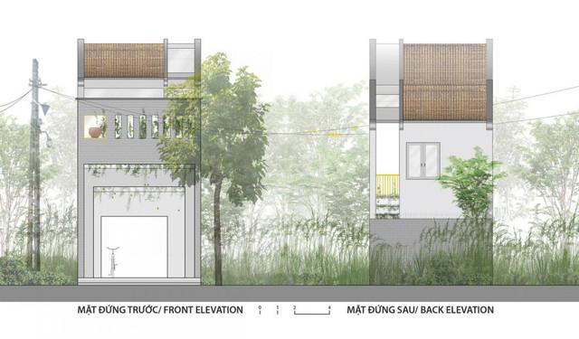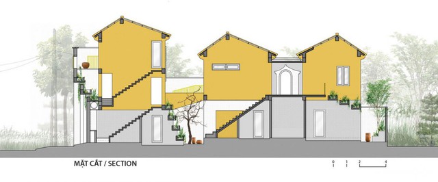 Dù mang những nét truyền thống cơ bản nhưng ngôi nhà vẫn được thiết kế rất thông thoáng với bốn 4 mặt đứng khác nhau tạo nên những khoảng trống bị kẹp ở giữa như những cái giếng rất thú vị để ánh sáng có thể len lỏi vào mọi ngóc ngách. Trong khi những không gian thông tầng tạo ra những lát cắt về ánh sáng cho ngôi nhà cũng như lấy sáng chủ đạo cho không gian bên dưới, cũng như là nguồn sáng trực tiếp cho những “Miệt vườn” nhỏ trong công trình...