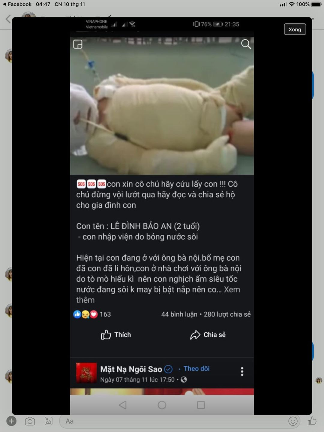 Trước đó, hồi cuối năm 2019, trên trang mạng xã hội facebook liên tục xuất hiện các tài khoản cá nhân chia sẻ thông tin và đứng ra quyên góp tiền cho trường hợp bệnh nhi Lê Đình Bảo An – 2 tuổi, bị bỏng do nghịch nước sôi và bé Nguyễn Minh Anh – SN 2007, bị hạch ung thư hạch lao đang điều trị tại bệnh viện Nhi Đồng 1.