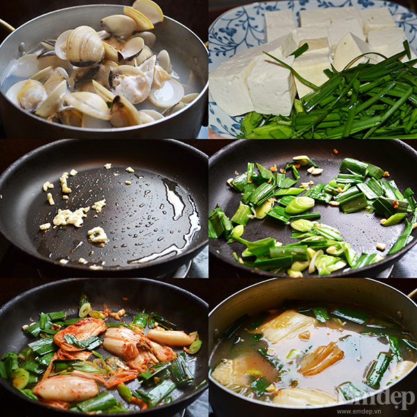 - Xào qua kim chi và tỏi tây rồi đổ phần nước luộc ngao và kim chi vào nấu cùng. Đến khi nước sôi thì cho rau hẹ vào nồi canh.