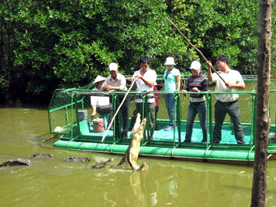 Khu đầm dành để câu cá sấu rộng 1,5 ha nằm ở một góc trong cùng của khu Vàm Sát, huyện Cần Giờ, TP HCM, ở đó có những con cá sấu cỡ 50 - 60 kg lờ lững nổi giữa dòng, phơi bộ da mốc thếch lên mặt nước.