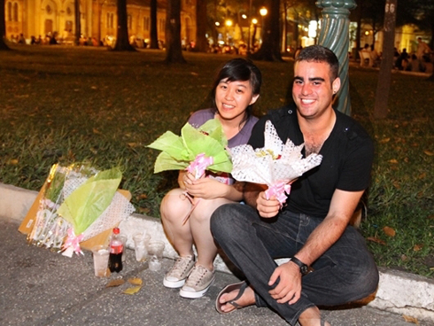 ![]() Will và cô bạn gái người Việt bán hoa ở công viên 30 tháng 4. Ảnh: Husky |