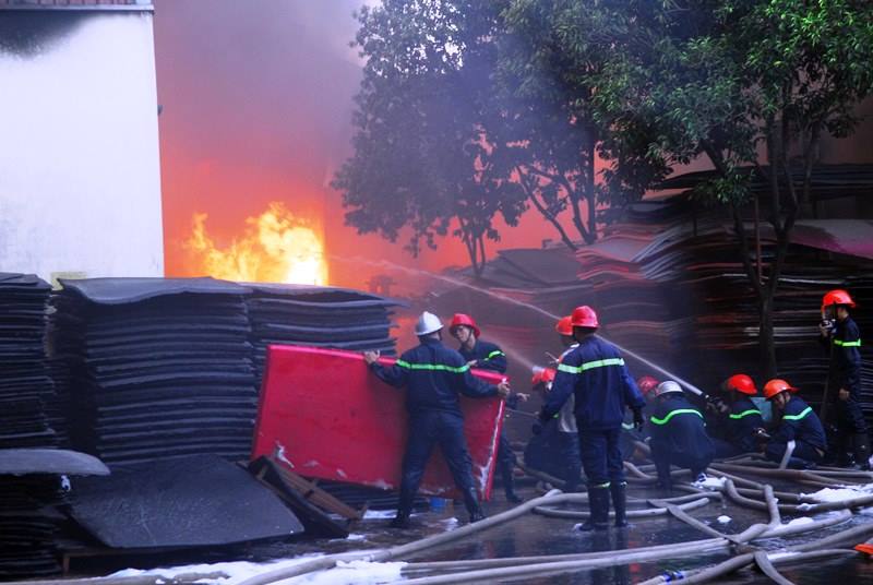 Một số công nhân đến làm việc chứng kiến xưởng cháy ngùn ngụt tỏ ra rất hoang mang, cho rằng lửa có thể đã cháy đến kho dầu trong công ty.