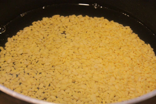 - Đỗ xanh đãi vài lần nước cho sạch, ngâm đỗ xanh vào thố nước ấm, ngâm khoảng từ 2 đến 3 tiếng.