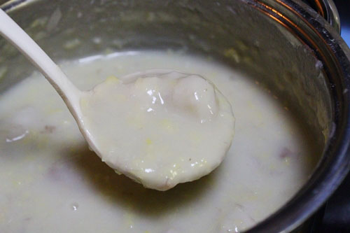 - Cho từ từ nước cốt dừa vào nồi khoai, đun sôi lửa nhỏ, thỉnh thoảng dùng muôi khuấy nhẹ tay để khoai không bị nát.