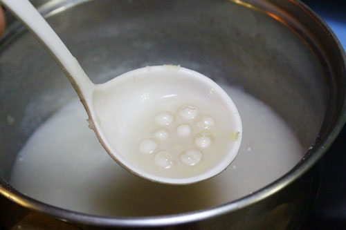 - Đun nồi nước sôi, thả trân châu vào đun sôi đến khi trân châu nổi trong là chín, vớt trân châu ra thố nước lạnh để chống dính.