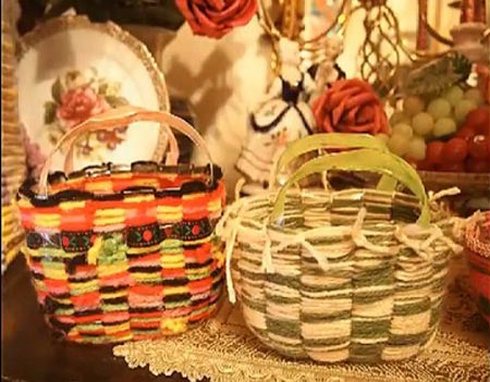 Đầu tiên, dùng kéo cắt dọc nhiều đường phần dưới chai nhựa, độ thưa tùy ý nhưng lưu ý phải cắt đều. Sau đó, quấn 2 cuộn len xen kẽ các rãnh vừa cắt (xem clip để được hướng dẫn rõ hơn cách quấn). Lưu ý, bạn chỉ quấn len cao khoảng 2cm, tiếp theo đặt tô vào trong vỏ chai để tạo khung quấn len, tô lớn hay nhỏ tùy vào kích thước chiếc giỏ bạn mong muốn.
