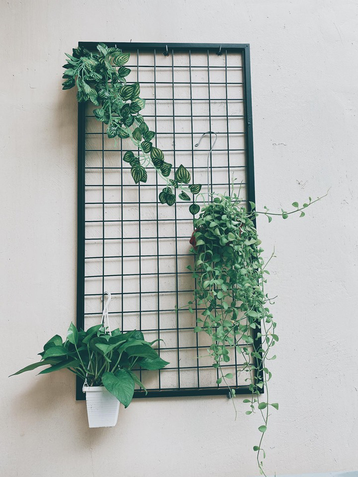 Vì ban công gia đình chỉ có không gian nhỏ hạn hẹp khoảng 4,5m2 nên chị Dung quyết định phải có màu xanh của hoa lá, có ánh đèn vàng lãng mạn, và bàn ghế nhỏ xinh đủ để 2 người ngồi uống nước: "Mình che lấp khoảng trống ở tường bằng một vài chi tiết như thanh lưới kết hợp với các cây treo, rồi tự làm macrame (kiểu như không gian tại Đà Lạt)… cho tươi mới, thân thiện".