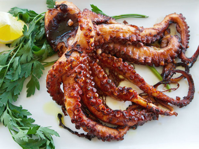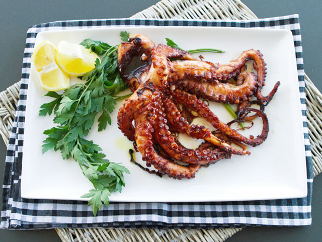 Ướp bạch tuộc với ít muối, tiêu, để thấm. Nhóm lửa cho than cháy đỏ hồng, thoa một phần dầu ăn lên vỉ nướng, sau đó dùng cọ quét một lớp dầu ô-liu lên khắp bạch tuộc, nướng khoảng vài phút đến khi có màu vàng nâu đẹp mắt.