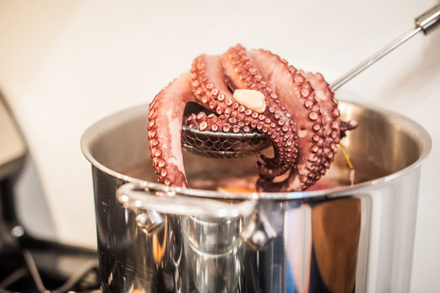 Rửa sạch bạch tuộc, cho vào nồi cùng với rượu trắng, hạt tiêu, nước cốt một trái chanh, tỏi đập dập.