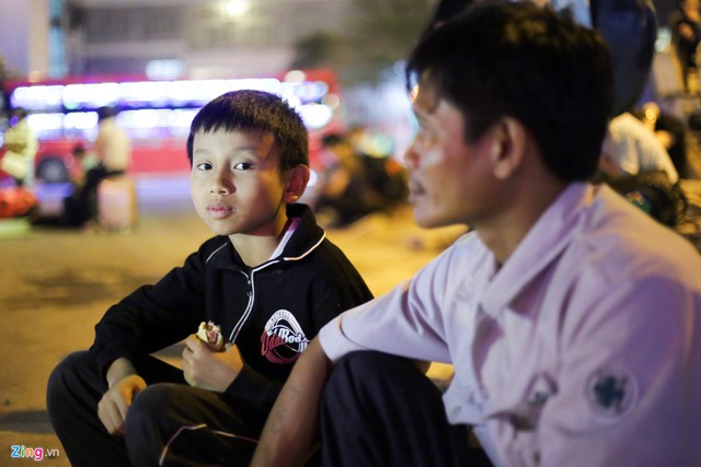 Anh Nguyễn Duy Khanh cùng con trai có mặt ở bến xe từ 14h30 để bắt xe về Kỳ Anh (Hà Tĩnh). Do không mua được vé về chuyến sớm nên hai bố con anh đành đặt vé tăng cường lúc 23h30. Nếu may mắn được lên xe đúng giờ họ sẽ có mặt ở nhà lúc 9h ngày 29/4. Tuy nhiên đã quá nửa đêm vẫn chưa thấy dấu hiệu của chiếc xe khách ấy.