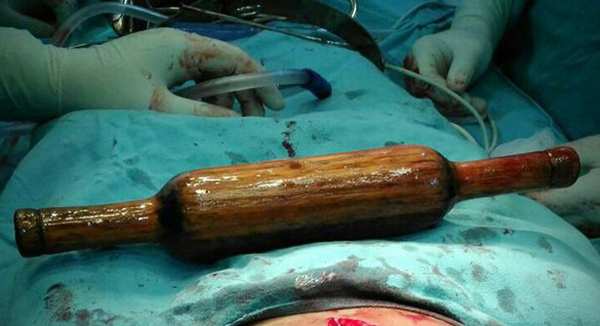 Người phụ nữ 38 tuổi được đưa tới bệnh viện đại học Y Chính phủ ở Haldwani, bang Uttarakhand, vào đúng ngày Giáng sinh sau khi bị đau bụng và sưng phù. Lúc tiến hành siêu âm, các bác sĩ phát hiện một chiếc chày cán bột bằng gỗ nằm trong ruột cô đã khiến cô bị tổn thương nghiêm trọng.