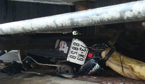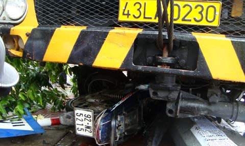 | Chiếc xe máy 92N2 - 5215 bị đè bẹp dưới gầm xe cẩu 43LA - 0230. |