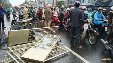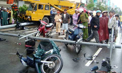 | Trụ đèn giao thông loại lớn ngã vật ra đường, đè lên hàng loạt người và xe đang đứng chờ đèn xanh, đèn đỏ ở ngã tư Điện Biên Phủ - Hà Huy Tập. |
