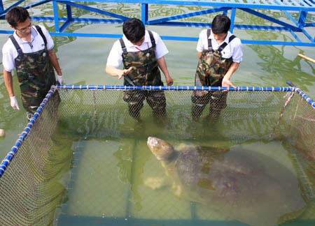 Phong cách ăn uống của cụ Rùa cũng khá cảnh vẻ, không phàm. Cơ thể xấp xỉ 1,7 tạ nhưng nhiều nhất một ngày “cụ” cũng chỉ dùng gần 1kg cá (2-3 con). Món khoái khẩu nhất với cụ có vẻ là cá trôi, chỉ một cú ngoạm, một tiếng “bụp” nhẹ nhàng là gọn gàng một chú cá. Ngày đầu tiên vào bể, thả xuống 4 con cá, cụ ăn được 2 con, nhưng có vẻ không mạnh dạn, hào hứng lắm. Lúc đầu các “bác sỹ” kê đơn… cá sống. Thấy cụ Rùa khó mà điều khiển cơ thể kềnh càng săn đuổi theo lũ cá, sau đó, thực đơn được điều chỉnh, cá được “sơ chế” (đập chết) trước khi cho vào bể, cụ Rùa xơi dễ dàng hơn. Nhưng cũng có ý kiến lo ngại, quen ăn sẵn, cụ Rùa sẽ sớm thành “gà công nghiệp”, thực đơn đổi lại món cá tươi sống kết hợp với thức ăn “sơ chế”.