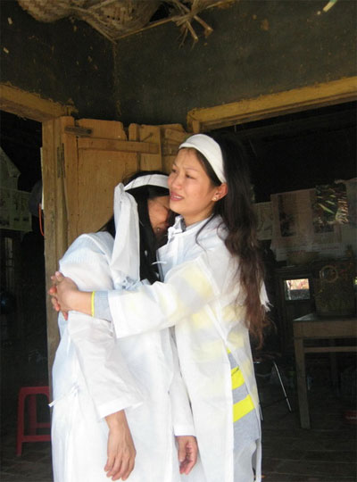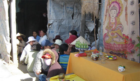 Vợ và con ông Lẽ vật vã bên bàn thờ khói hương nghi ngút. |