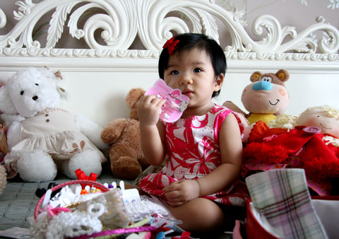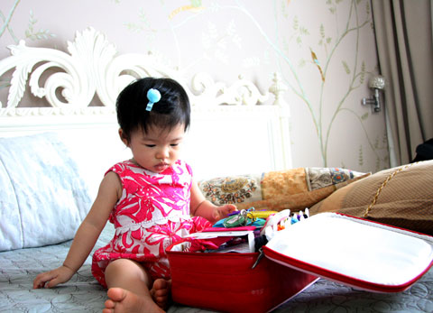 ![]() Nghịch ngợm vali đựng phụ trang, đồ làm điệu là sở thích của Bảo Tiên. |