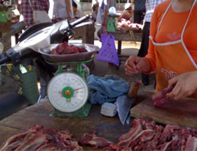 Một số quầy bán thịt bò có tới 80% số thị lợn nái sề đã được chủ quầy trộn vào với thịt bò để “lòe” người mua hàng.