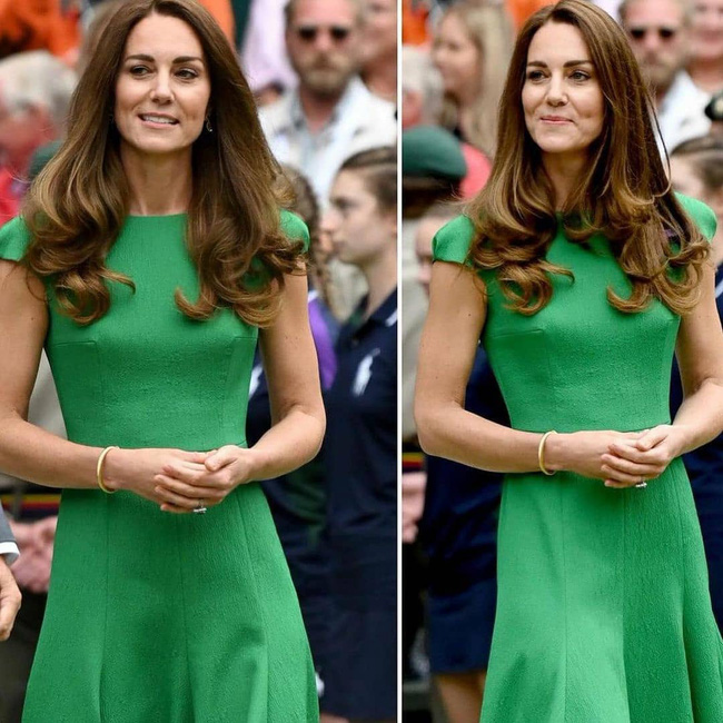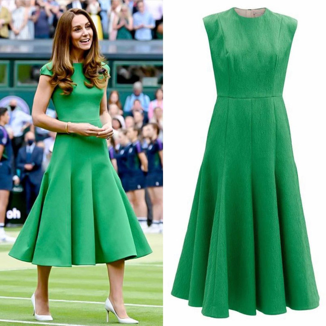 Bộ váy xanh trơn màu dáng midi cổ điển này nhìn qua thì không hề có bất kỳ vấn đề nào. Công nương Kate thanh lịch nhẹ nhàng trong bộ đầm xanh, kết hợp cao gót màu trắng trang nhã, mái tóc xõa bồng bềnh càng tăng thêm vẻ ngoài xinh đẹp thanh tú của cô.