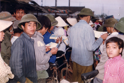 Phát tờ rơi tuyên truyền chiến dịch ở huyện Tân Kỳ, Nghệ An. Ảnh: Hồ Hà. |