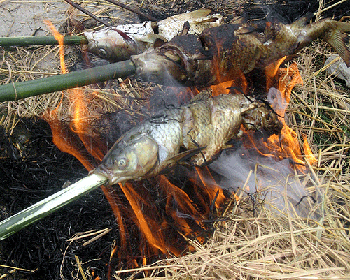 Đây là một món ăn truyền thống, độc đáo, thơm ngon, bổ dưỡng lại rất lạ miệng với thực khách. Đối với món cá nướng này, người ta dùng các loại cá bản to như chép , mè , trôi , chắm …, con độ một cân , cân rưỡi, có như vậy cá mới nhiều thịt. Cá mang về nhà rửa sạch, mổ từ sống lưng trở xuống để lấy sạch ruột, rồi xoa một lượng muối rang nổ vào cả bên trong và bên ngoài cá.