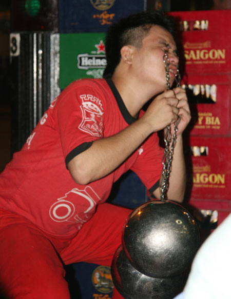 Ở cách đó không xa, một thanh niên khác đang bê hai quả tạ kim loại, to bằng trái bóng có gắn móc nhọn, bắt đầu một màn trình diễn "khó nuốt".