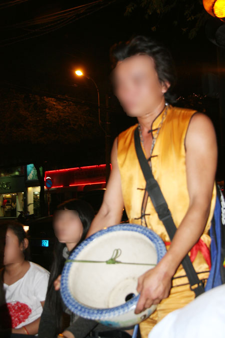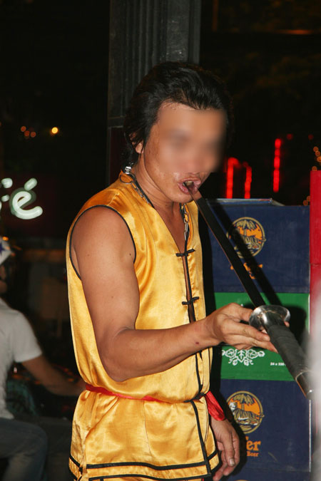 Mỗi đêm, các tay xiếc dạo kiếm đượckhoảng 100 - 200 ngàn đồng từ tiền ủng hộ của thực khách tại các quán nhậu đêm. Ảnh: Trí Quang |