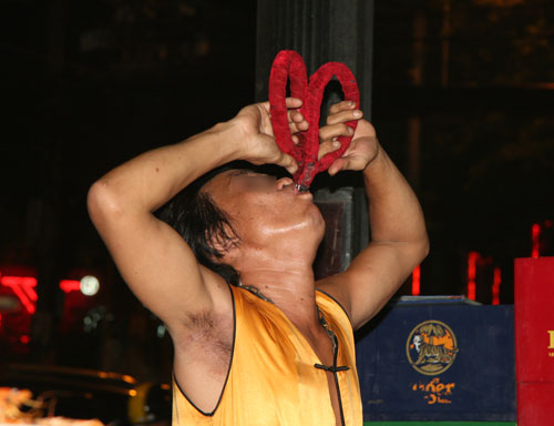 Một tay xiếc dạo đang nuốt gọn cả hai lưỡi kéo dài nhọn vào bụng. Ảnh: Trí Quang |