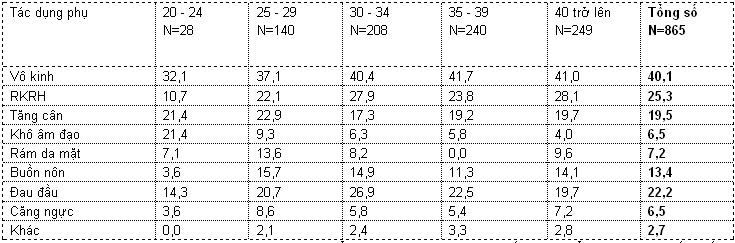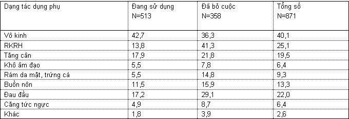 Trong tổng số 871 khách hàng có tới 770 người gặp tác dụng phụ chiếm tỷ lệ 88,4%, trong đó nhóm đang sử dụng là 87,3% và nhóm đã bỏ cuộc là 89,9%.