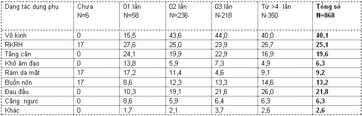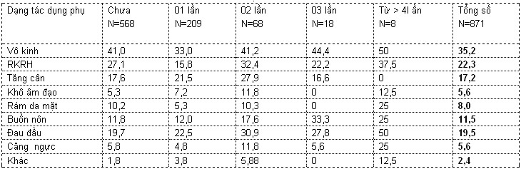Không có nhiều sự khác biệt giữa nhóm chưa nạo, hút với các nhóm có nạo hút. Mặc dù vậy vẫn có sự tăng cao hơn về tỷ lệ các tác dụng phụ ở các nhóm có 02 lần và từ 4 lần nạo, hút thai trở lên trở lên