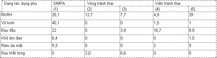 Thuốc tiêm tránh thai DMPA gây nhiều tác dụng phụ, chiếm tới 88,4% khách hàng, trong đó chủ yếu là vô kinh 40,1%; rối loạn kinh nguyệt 25,1%, (như vậy sự thay đổi về kinh nguyệt chiếm tới 65,2%); tiếp theo là tăng cân 19,5%; đau đầu và buồn nôn với tỷ lệ tương ứng là 22,0% và 13,3%. Hai dấu hiệu đặc trưng liên quan đến nội tiết là rám da mặt 9,3% và khô âm đạo 6,4%.