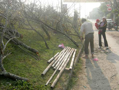 Cận Tết, những vườn đào rừng chính hiệu mọc lên ngay giữa thủ đô. Các tay săn đào và các lái buôn chở đào về Hà Nội rồi ghim xuống đất bằng ống luồng (đổ nước vào ống luồng để giữ cho đào tươi).