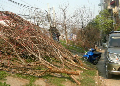 Chỉ trong hai ngày qua mà đào rừng được các thương lái đưa về trải dài hai bên đường đê Yên Phụ. |