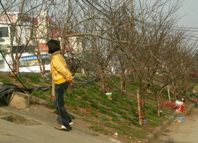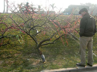 Ông Nguyễn Mạnh Đức, một chủ lái đào rừng, người Hà Tây vừa cặm cụi tưới những cành đào trong vườn mà ông vừa vượt vài trăm cây số về xuôi, vừa giải thích với hết lượt khách này đến lượt khách khác về giá trị đích thực của loại đào này.