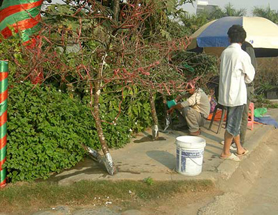 Ông Nguyễn Mạnh Đức, một chủ lái đào rừng, người Hà Tây đang cặm cụi tưới cho cây sau một chặng đường dài đưa cây từ rừng về. |