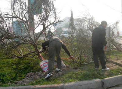Những kẻ săn đào không ngần ngại khi bấng cả gốc đào rừng đưa về Hà Nội. |