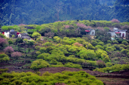 Một góc sườn đồi tại cao nguyên Mộc Châu, đào nở đỏ xen lẫn với các cây mận tạo nên những mảng màu đẹp mắt. |